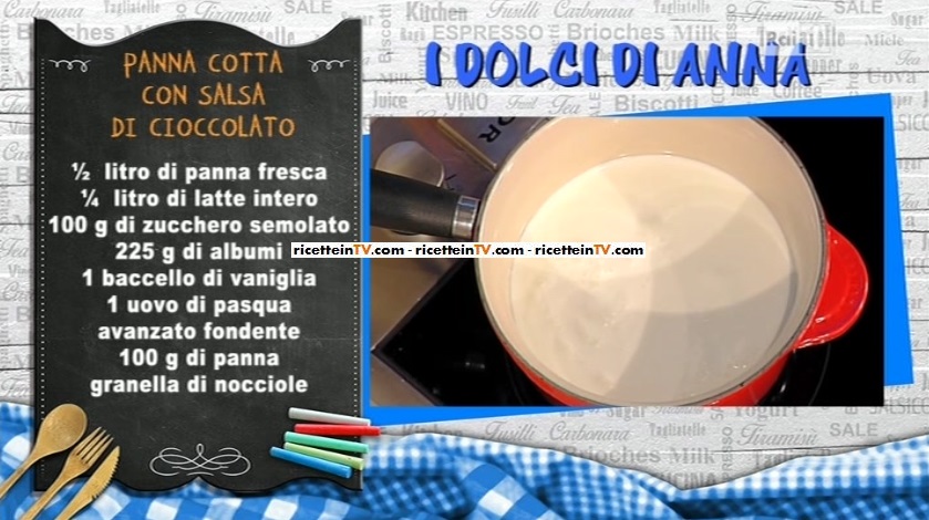 panna2Dopo le feste, riprende il “solito” corso de La prova del cuoco. Apriamo il menu “dolcemente“, con il dessert di Anna Moroni, che utilizzando le uova di Pasqua avanzate, prepara la panna cotta con salsa al cioccolato.