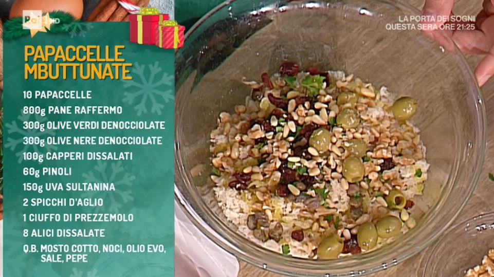 - 10 papaccelle, 800 g pane raffermo, 300 g olive verdi denocciolate, 300 g olive nere denocciolate, 100 g capperi dissalati, 60 g pinoli, 150 g uva sultanina, 2 spicchi d’aglio, 1 ciuffo di prezzemolo, 8 alici dissalate, mosto cotto, noci, olio evo, sale e pepe