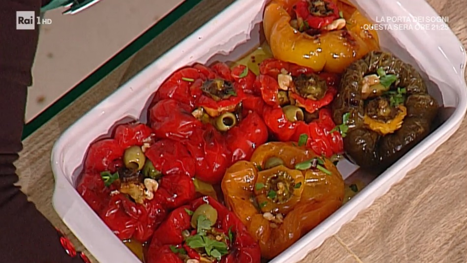 Farciamo le papaccelle con il ripieno. Le disponiamo su una pirofila e finiamo con un filo d’olio. Cuociamo in forno caldo e statico a 180° per 30 minuti: a metà cottura, bagniamo i peperoni con un po’ di mosto cotto.
