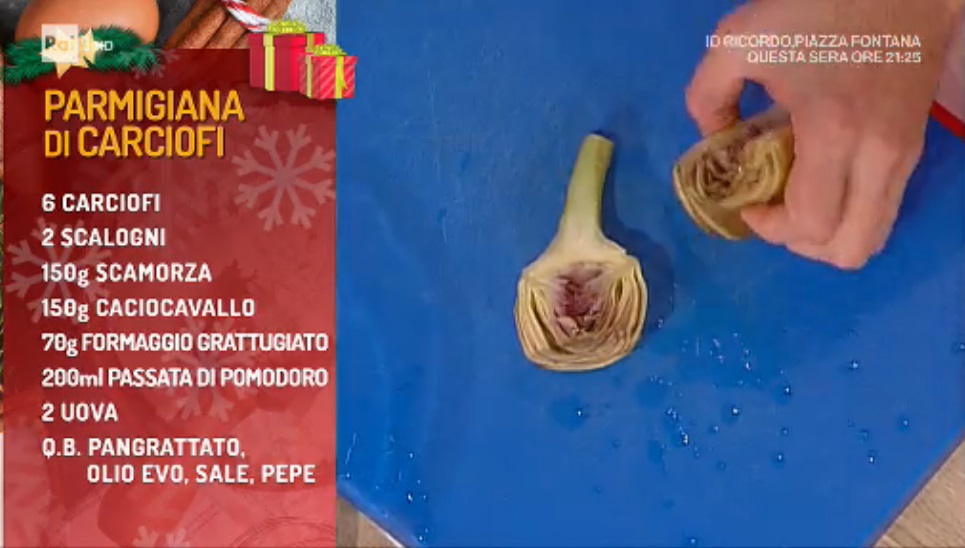 Formiamo la parmigiana: imburriamo una pirofila e la spolveriamo con del pangrattato. Formiamo un primo strato di sugo, proseguiamo con i carciofi, il formaggio grattugiato, scamorza e caciocavallo grattugiati, basilico fresco, un po’ di sugo e di uova sbattute. Ancora carciofi, formaggi e sugo. Versiamo sopra le uova sbattute rimaste e spolveriamo con del pangrattato. Cuociamo in forno caldo e statico a 160° per 20 minuti.