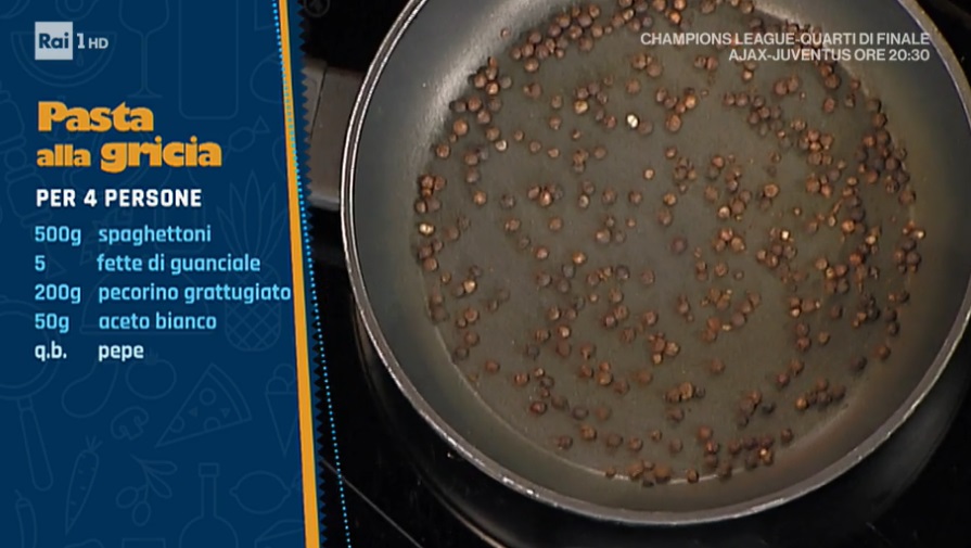 - 500 g spaghettoni, 5 fette di guanciale, 200 g pecorino grattugiato, 50 g aceto bianco, pepe