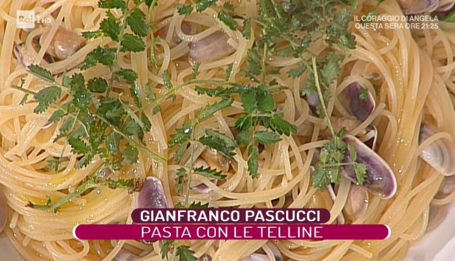 - 320 g spaghettini, 200 g telline, mezzo spicchio d’aglio, 70 g vino bianco, 2 filetti di pelati, prezzemolo, peperoncino, olio evo
