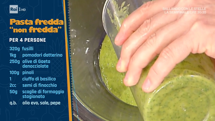 - 320 g fusilli, 1 Kg pomodori datterino, 250 g olive di Gaeta denocciolate, 100 g pinoli, 1 ciuffo di basilico, 2 cc semi di finocchio, 50 g scaglie di formaggio stagionato, olio, sale e pepe