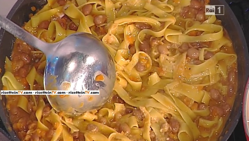 Prepariamo la pasta all’uovo nel classico modo, impastando uova e farina; lasciamo riposare il panetto, quindi ricaviamo le tagliatelle. Sciogliamo in un pentolino il burro; mettiamo a soffriggere il trito di sedano, carota e cipolla. Profumiamo con il rosmarino legato con uno spago, in modo che non perda gli aghi; uniamo i fagioli prelessati (ma non troppo) e sfumiamo con del vino bianco. Allunghiamo con brodo vegetale, uniamo il concentrato di pomodoro e lasciamo cuocere per 1 ora e mezza. Lessiamo le tagliatelle in acqua salata. Le scoliamo e le mettiamo in padella col sugo. Facciamo saltare per qualche minuto. Serviamo con parmigiano grattugiato.