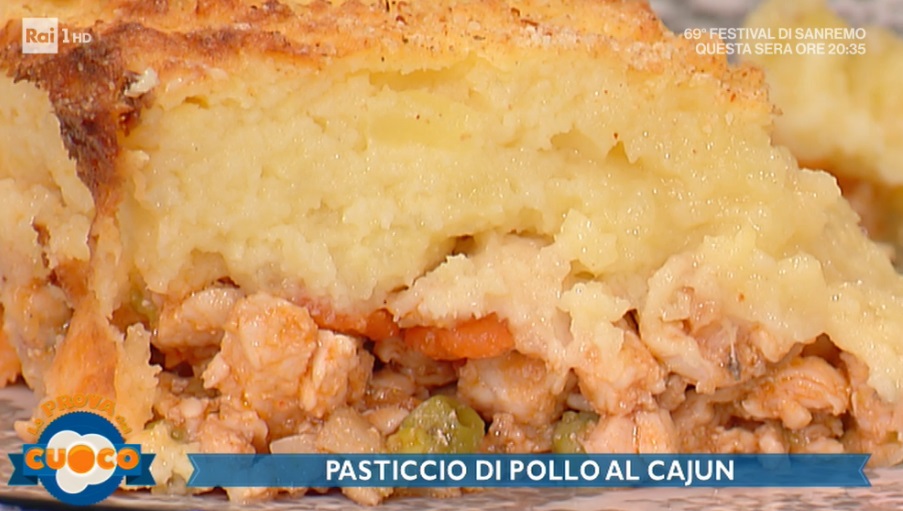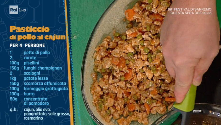 - 1 petto di pollo, 2 carote, 100 g pisellini, 150 g funghi champignon, 2 scalogni, 1 Kg patate lesse, 150 g scamorza affumicata, 100 g formaggio grattugiato, 100 g burro, 50 g concentrato di pomodoro, cajun, olio, pangrattato, sale, rosmarino