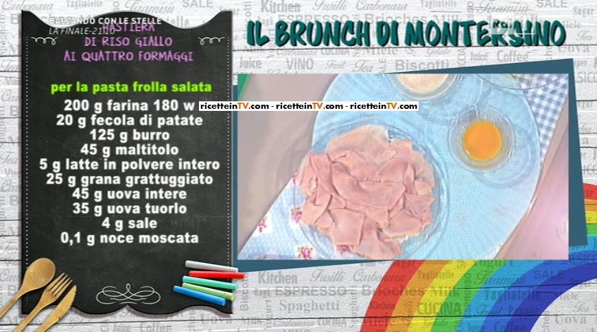 - Per la frolla salata: 200 g farina, 20 g fecola, 125 g burro, 45 g maltitolo, 5 g latte in polvere intero, 25 g grana grattugiato, 45 g uova intere, 35 g uova tuorlo, 4 g sale, 0,1 g noce moscata