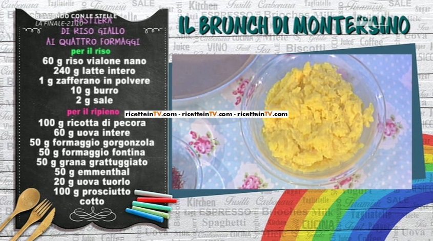 - Per il ripieno: 100 g ricotta di pecora, 60 g uova intere, 50 g formaggio gorgonzola, 50 g formaggio fontina, 50 g grana grattugiato, 50 g emmenthal, 20 g uova tuorlo, 100 g prosciutto cotto