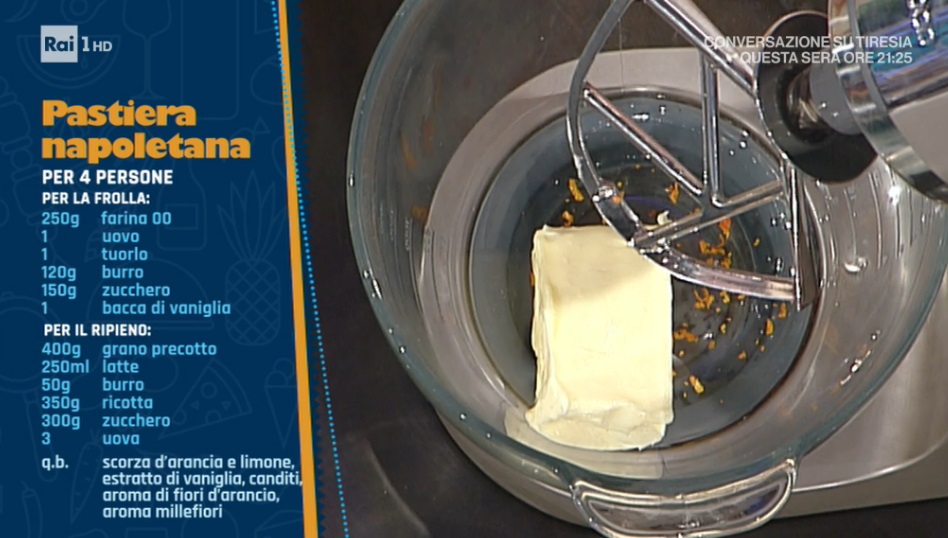 - Ripieno: 400 g grano precotto, 250 ml latte, 50 g burro, 350 g ricotta, 300 g zucchero, 3 uova, scorza d’arancia e limone, canditi, aroma di fiori d’arancio, aroma millefiori