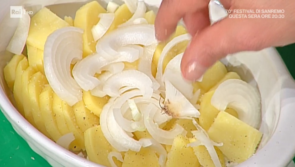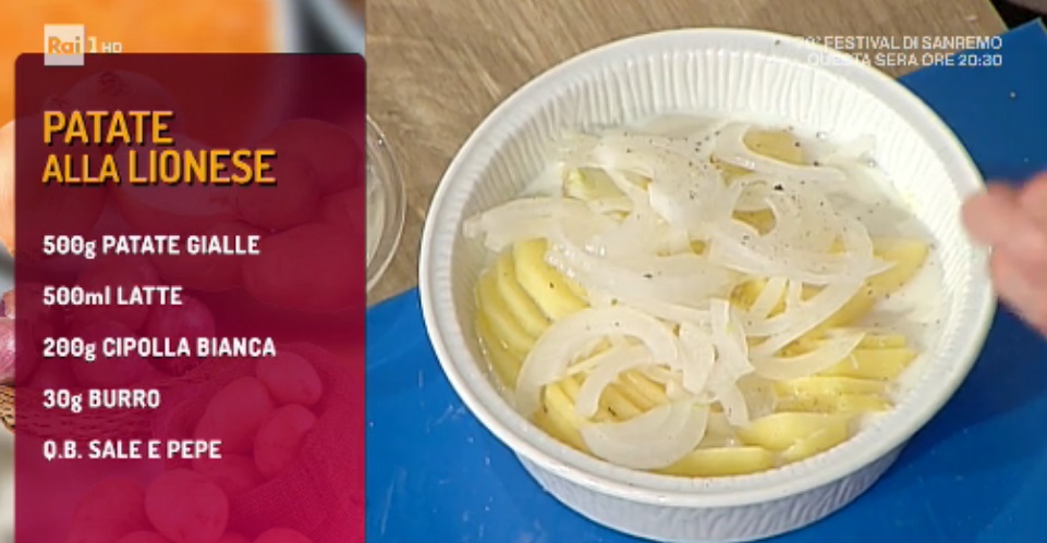All’interno di una pirofila o teglietta imburrata, disponiamo le patate a fettine, mantenendone in verticale. Le condiamo con sale e pepe. Distribuiamo sopra la cipolla affettata, ancora sale e pepe. Copriamo con il latte e qualche fiocchetto di burro. Cuociamo in forno caldo e statico a 180° finchè il latte non è stato completamente assorbito.