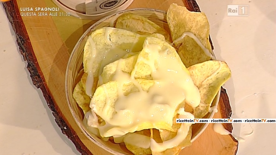 I segreti per fare delle chips golosissime: usare delle patate buone, a pasta gialla, possibilmente di montagna. Peliamo le patate e le immergiamo in acqua calda, in una ciotola. Quindi, le tagliamo sottilissime, con la mandolina, e le facciamo cadere in acqua fredda. Saliamo l’acqua con sale grosso e mescoliamo leggermente. Trasferiamo la ciotola, con le patate in ammollo, per almeno 18 ore. Otterremo delle patate leggermente piegate. Tuffiamo le patate ben sgocciolate in olio di semi di girasole profondo e a 170°. Dopo qualche istante, le giriamo un po’ nell’olio. Quando sono dorate, le scoliamo e lasciamo su della carta assorbente. Bonci serve le sue patatine con una fonduta di formaggio.
