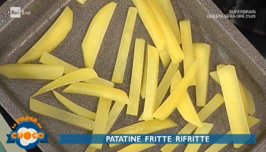 Peliamo le patate e le tagliamo a stick o fettine. Le tuffiamo in acqua ben fredda e le lasciamo a bagno anche qualche ora, in modo che perdano l’amido. Le scoliamo e le scottiamo in acqua bollente e salata per 1 minuto e mezzo – 2 minuti. Oppure, le scoliamo, le asciughiamo bene e le friggiamo in olio a 140°. Scoliamo entrambe le preparazione e lasciamo asciugare a temperatura ambiente per 4 ore circa.