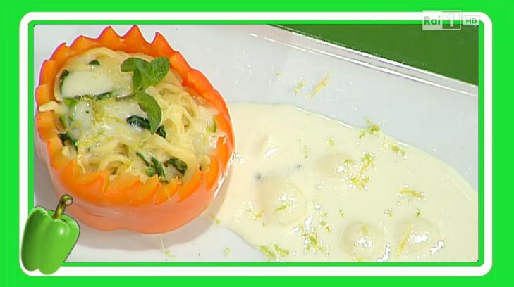 Tagliare il peperone a metà, privarlo dei semi e cuocerlo in acqua bollente salata con il vino, l’aceto e l’alloro. Impastare la farina con le uova, stendere la sfoglia, passarla attraverso l’apposito attrezzo e ricavare i tagliolini. Cuocerli in acqua bollente salata, scolarli, saltarli in un tegame con il burro, l’olio, il basilico, poco vino bianco e la buccia grattugiata del limone. Farcire il peperone con i tagliolini, spolverare con la casatella grattugiata, far gratinare in forno a 180° per 10’ e poi servire.