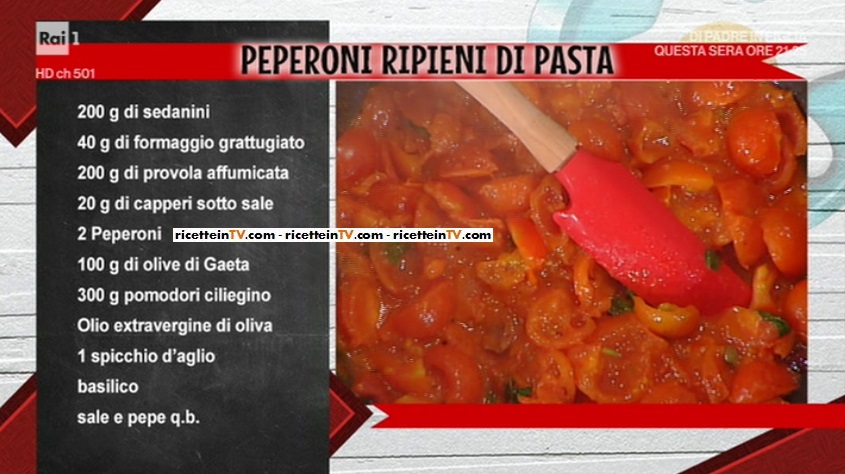 - 200 g pasta sedanini, 40 g formaggio grattugiato, 200 g provola affumicata, 20 g capperi, 2 peperoni rossi o gialli, 100 g olive di Gaeta, olio evo, 300 g pomodorini, 1 spicchio d’aglio, basilico, sale e pepe