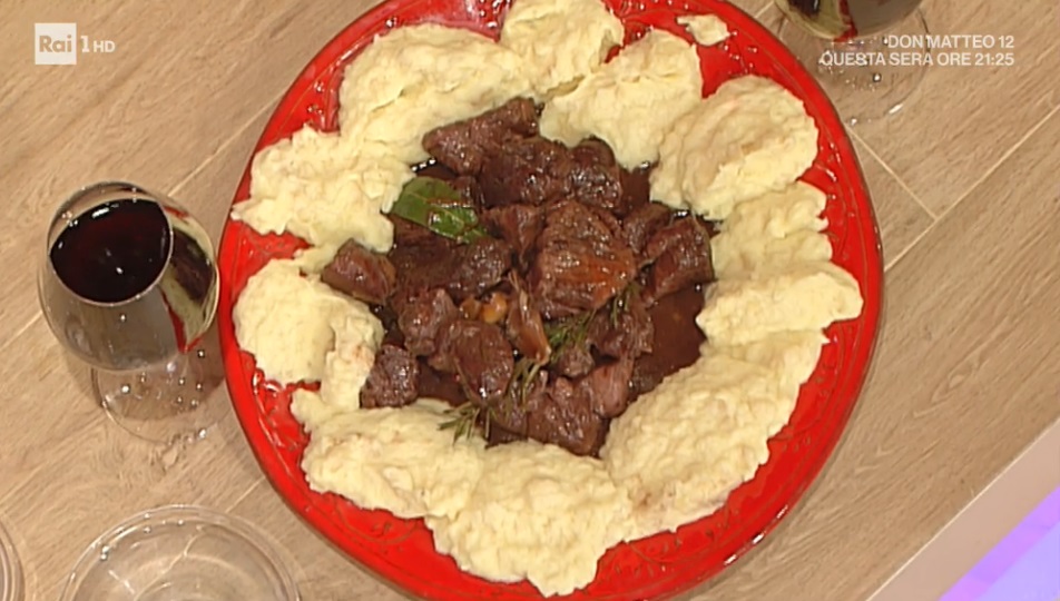 Serve una carne di seconda scelta, più fibrosa e tosta. La tagliamo a pezzettoni grossi e li mettiamo in un tegame con un fondo di abbondante olio, 6 spicchi d’aglio in camicia, una manciata di pepe nero in grani, un paio di chiodi di garofano, un pizzico di spezie miste (cannella, peperoncino, macis ecc) e le erbe aromatiche. Lasciamo rosolare la carne per bene, mescolando. Copriamo il tutto con il vino rosso e saliamo. Mettiamo il coperchio e cuociamo a fuoco basso per 3 ore. A fine cottura, spolveriamo con il pepe nero macinato.