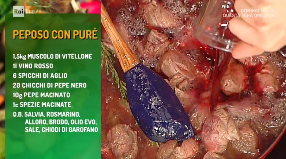 - 1,5 Kg muscolo di vitellone, 6 spicchi di aglio vestiti, 1 l Chianti rosso, 20 chicchi di pepe nero, 10 g pepe macinato, salvia, rosmarino, alloro, 1 cucchiaino di spezie macinato, brodo, olio evo, sale