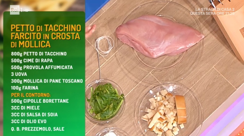 - 800 g petto di tacchino, 500 g cime di rapa, 500 g provola affumicata, 3 uova, 300 g mollica di pane toscano, 100 g farina