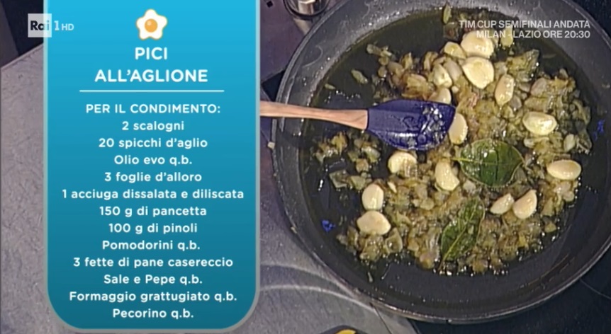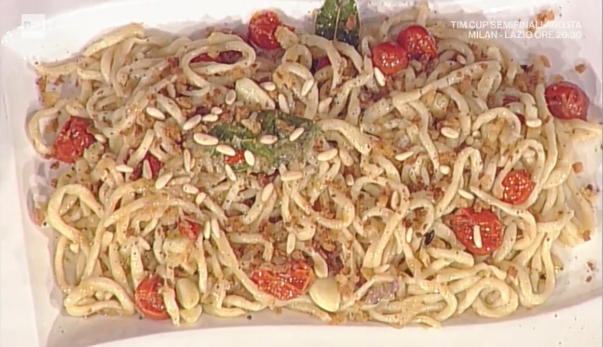 Scoliamo i pici e li ripassiamo con il condimento all’aglio. Serviamo con la mollica dorata, guanciale e pinoli tostati. Completiamo con una spolverata di pecorino grattugiato.