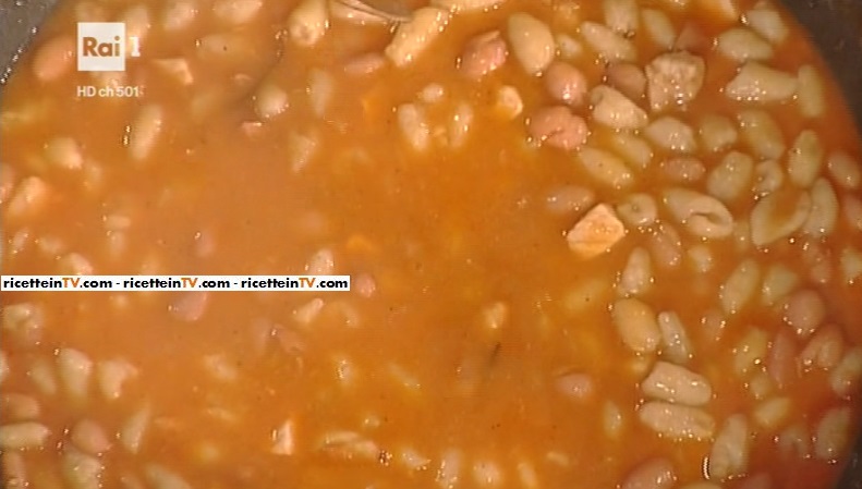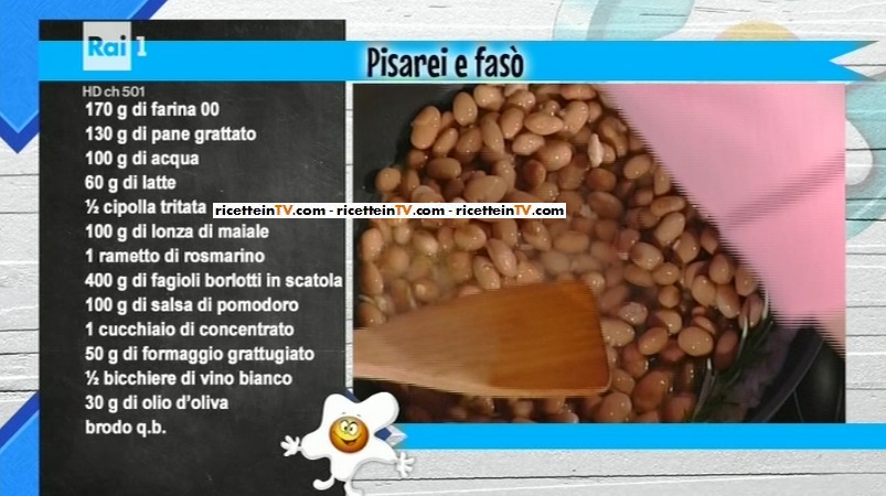 Il primo piatto di Daniele Persegani apre il menu odierno. Il simpatico cuoco emiliano prepara un classico della cucina nostrana: pasta e fagioli, ovvero pisarei e fasò.