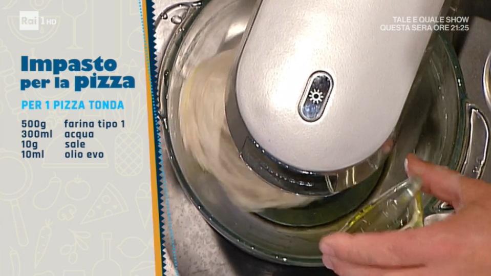 Nell’impastatrice, mettiamo il lievitino pronto, la farina rimasta e l’acqua. Quando il tutto è ben amalgamato, aggiungiamo il sale e l’olio. Impastiamo ancora per 10-15 minuti. Posizioniamo il panetto all’interno di un contenitore e lo copriamo con la pellicola. Lasciamo lievitare per 20 minuti circa.