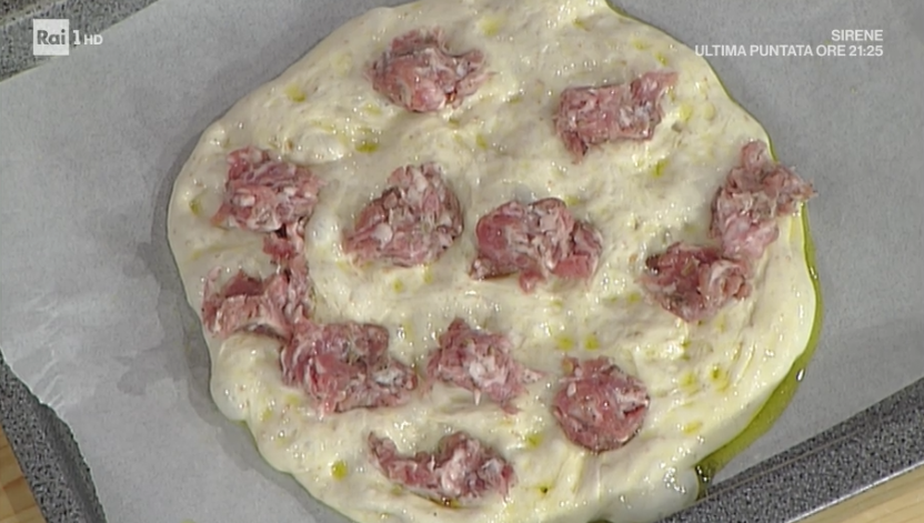 Ci serve una teglietta rotonda, simile ad una tortiera. La ungiamo con abbondante olio ed inseriamo all’interno il panetto di impasto già pronto (qui la ricetta base della pizza di Bonci, che oggi ha realizzato con farina tipo 2). Lasciamo lievitare per una notte, in frigorifero. Stendiamo all’interno della teglia. Lasciamo lievitare ancora per 1-2 ore al caldo. Trasferiamo su una teglia rettangolare coperta con carta forno, senza stenderla ulteriormente. Disponiamo sopra della salsiccia sgranata e ancora cruda. Inforniamo al massimo della temperatura, nella parte bassa. Quasi a fine cottura, dopo 10 minuti, spostiamo a metà forno e lasciamo cuocere altri 5 minuti o fino a doratura.