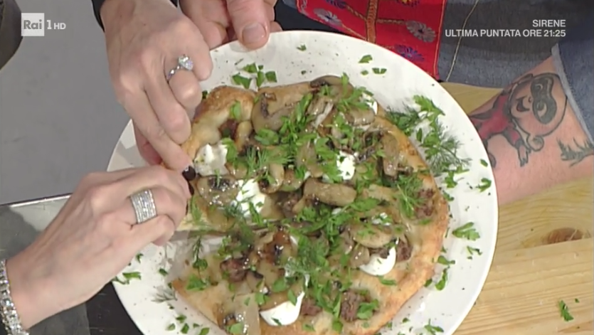 Tagliamo a fette la pizza e su ogni spicchio formiamo un ciuffo di ricotta di pecora setacciata (in modo da renderla una crema soffice e vellutata) e disponiamo sopra dei funghi champignon affettati cotti in padella con un filo d’olio e l’aglio. Completiamo con prezzemolo tritato, finocchietto selvatico e pepe macinato al momento.