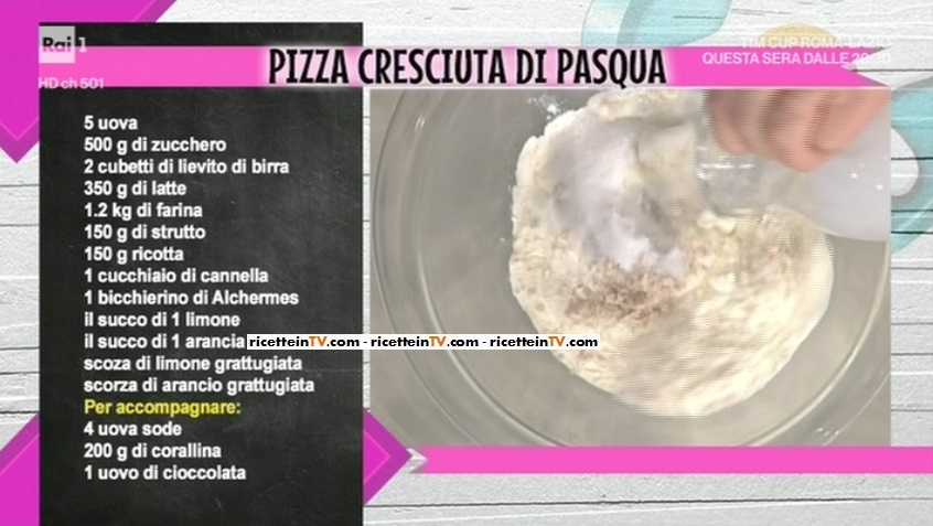 - 5 uova, 500 g zucchero, 2 cubetti di lievito di birra, 350 g latte, 1,2 Kg farina, 150 g strutto, 150 g ricotta, 1 cucchiaio di cannella, 1 bicchierino di Alchermes, il succo di 1 limone, il succo di 1 arancia, scorza grattugiata agrumi