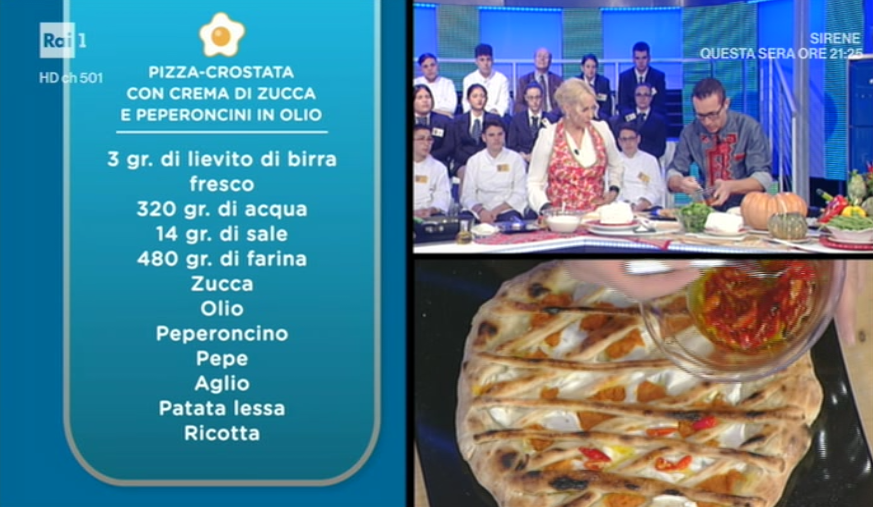 - 3 g lievito di birra fresco, 320 g acqua, 14 g sale, 480 g farina, zucca, olio, peperoncino, pepe, aglio, patata lessa, ricotta