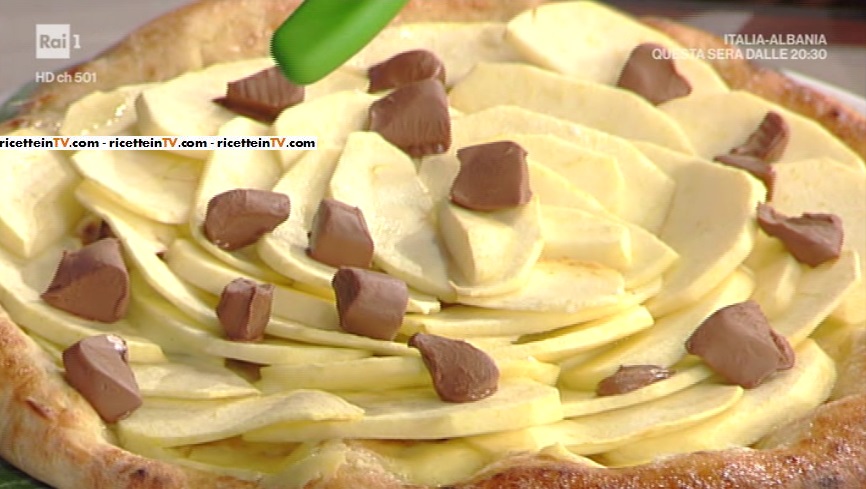 Per la prima variante: a metà cottura, sforniamo la pizza, formiamo uno strato di crema pasticcera e disponiamo sopra delle fettine di mela. Inforniamo nuovamente. All’uscita dal forno, impreziosiamo con dei pezzetti di cioccolato gianduia, che si scioglierà sulla pizza e diverrà ancora più goloso.