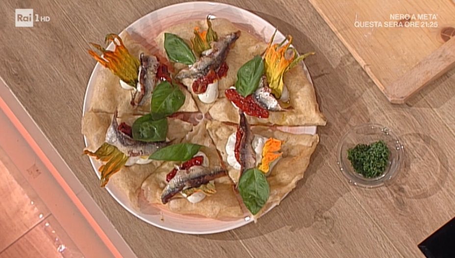 Tagliamo la pizza a spicchi e su ciascuna porzione mettiamo la crema di ricotta, i pomodori secchi sott’olio, fiori di zucca essiccati in forno (facoltativi), filetti di alici dissalati e basilico fresco.