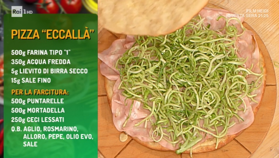 Puliamo le puntarelle e le condiamo con olio e sale. Apriamo la pizza appena sfornata e la condiamo con la crema di ceci, la mortadella affettata e infine le puntarelle condite. Chiudiamo con l’altro disco di pizza e serviamo.