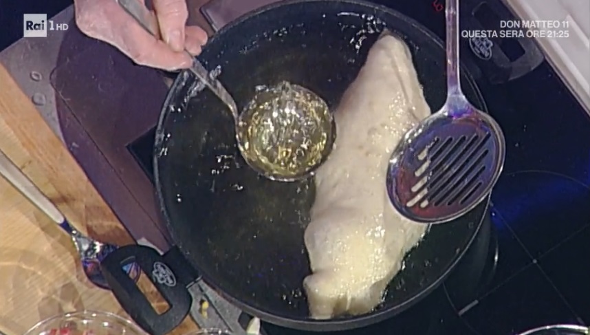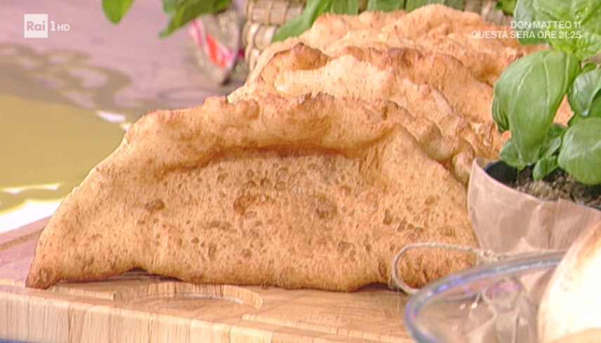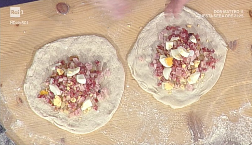 Stendiamo ciascun panetto con le mani, in modo da ottenere dei dischi. Mettiamo al centro i salumi a cubetti piccoli, ovvero salame, prosciutto cotto, ciccioli di maiale e, infine, provolone piccante a cubettini e uova sode a pezzetti. Richiudiamo l’impasto sul ripieno e sigilliamo bene i bordi, in modo da ottenere una mezzaluna. A questo punto possiamo friggere la pizza in olio bollente (190°), rigirandola spesso e nappandola con l’olio bollente. La facciamo sgocciolare su carta assorbente quando è ben dorata. Oppure, la spennelliamo con l’olio e la inforniamo al massimo della temperatura, fino a doratura.