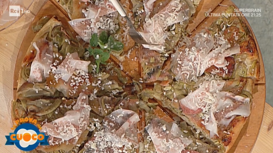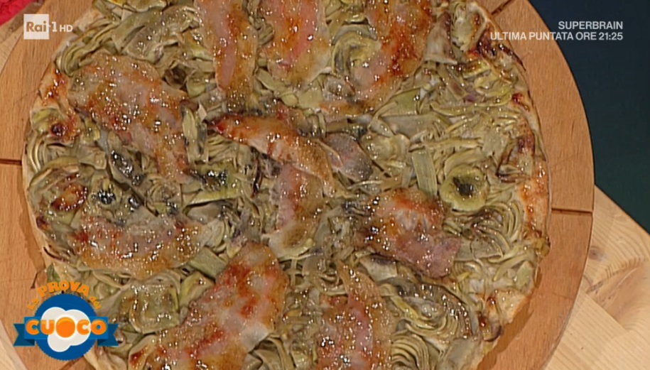 Su un piano infarinato, stendiamo la pizza. La adagiamo su carciofi e guanciale (si, è una pizza capovolta!). Ungiamo con l’olio la superficie della pizza, saliamo ed inforniamo, sul fondo del forno, al massimo della temperatura. Una volta cotta, capovolgiamo la pizza su un piatto da portata e completiamo con altro guanciale affettato e del pecorino grattugiato.