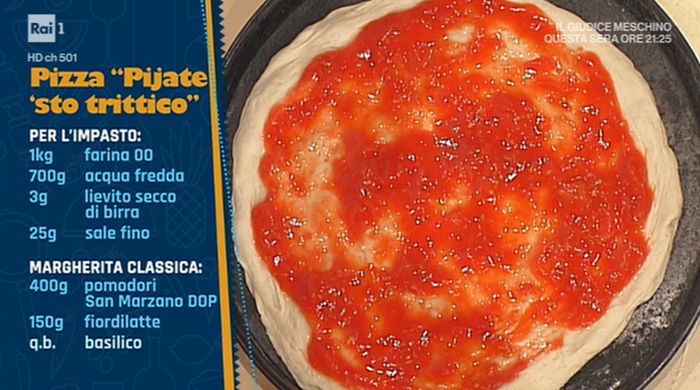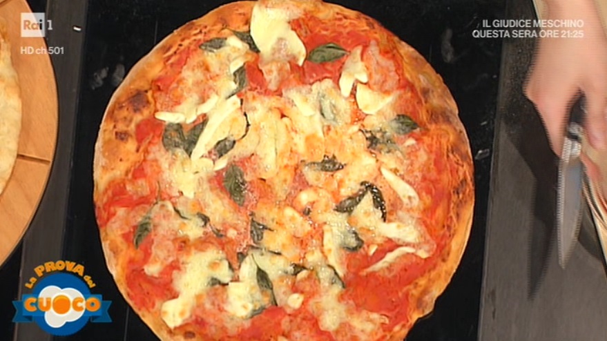 Margherita classica: stendiamo il panetto e lo condiamo con i pomodori pelati e schiacciati. Cuociamo in forno preriscaldato a 250° per 12 minuti circa. All’uscita dal forno, finiamo con basilico e fior di latte a listarelle e ripassiamo in forno per circa 3 minuti.