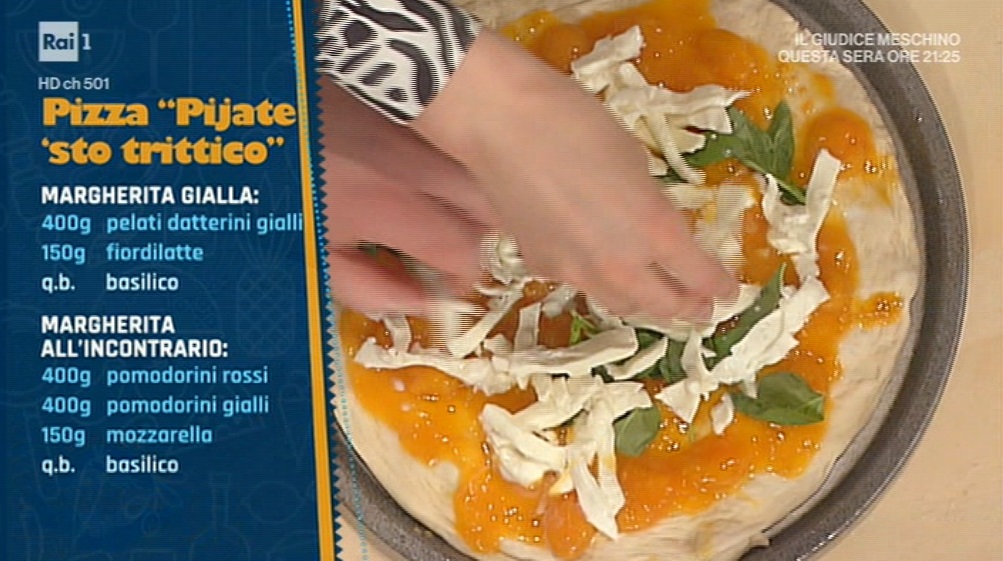 Margherita gialla: stendiamo il panetto e lo condiamo con i datterini gialli pelati e schiacciati. Cuociamo in forno preriscaldato a 250° per 10 minuti circa. All’uscita dal forno, finiamo con basilico e fior di latte a listarelle.