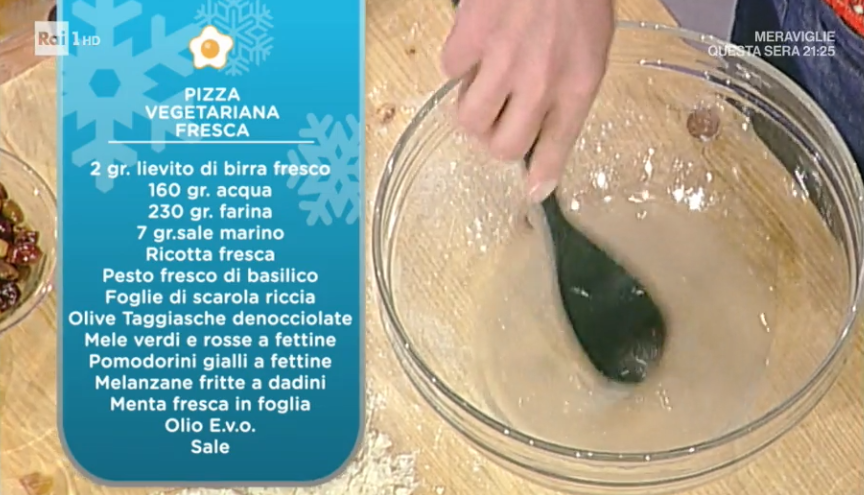 - 160 g acqua, 2 g lievito naturale fresco, 7 g sale, 230 g farina 0 o 00, ricotta fresca, pesto fresco di basilico, foglie di scarola riccia, olive taggiasche denocciolate, mele verdi e rosse a fettine, pomodorini gialli a fettine, melanzane fritte a dadini, menta fresca, olio evo, sale