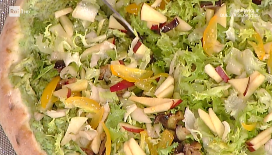 Intanto, condiamo della scarola riccia a pezzetti con olive denocciolate, mela a cubetti, melanzane fritte a cubetti, pomodorini gialli a fettine. Mescoliamo il tutto per bene e disponiamo sulla pizza appena sfornata. Serviamo.