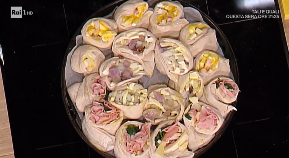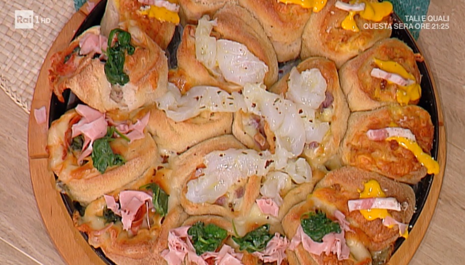 Procediamo allo stesso modo con gli altri 2 panetti, diversificando il ripieno: nel secondo ci vanno degli spinaci scottati e saltati in padella con il burro, la provola e la mortadella affettata. L’ultimo rotolo, invece, lo farciamo con le patate viola lesse e sbriciolate, il baccalà a fettine sottilissime, fiordilatte a listarelle e polvere di olive.