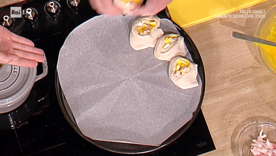 Stendiamo ciascun panetto in modo da dare la forma di un rettangolo. Su questo, quindi, disponiamo il fiordilatte a striscioline, i tuorli sbattuti con il pecorino grattugiato e la pancetta o guanciale a listarelle. Arrotoliamo e tagliamo il rotolo ottenuto a fette spesse circa 5 cm. Disponiamo quest’ultime, come fossero delle rose, all’interno di una teglia rotonda, distanziandole di pochi mm.