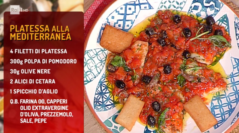 - 4 filetti di platessa, 300 g polpa di pomodoro, 30 g olive nere, 2 alici di Cetara, 1 spicchi d’aglio, farina 00, capperi, olio evo, prezzemolo, sale, pepe