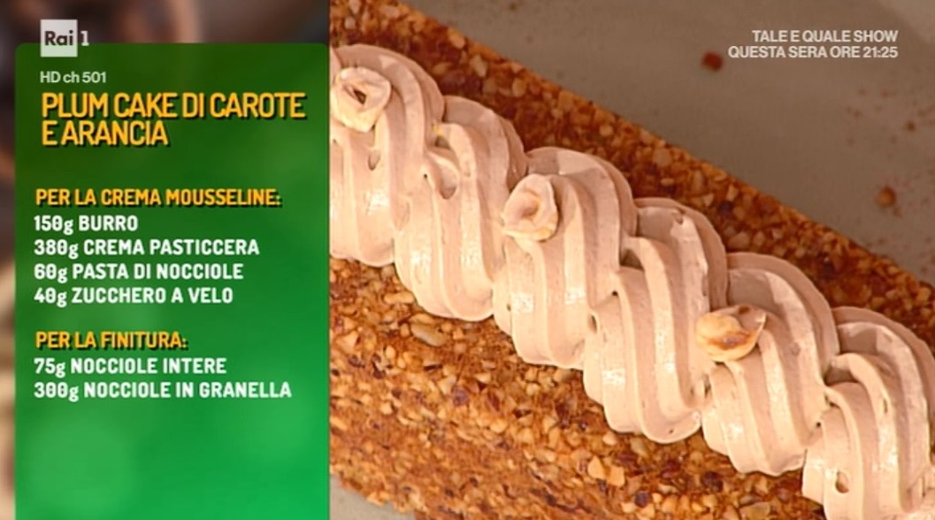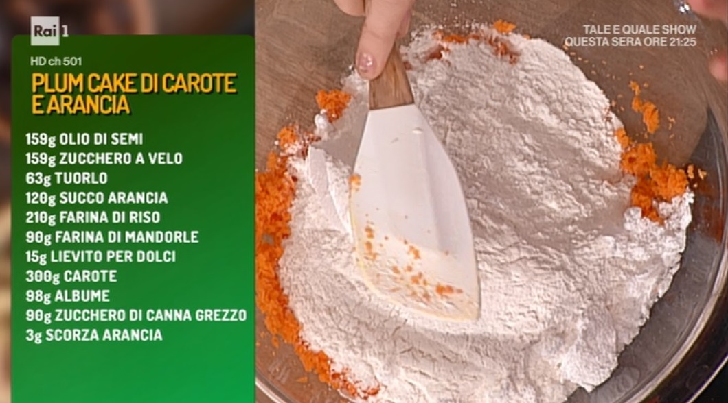 - 159 g di olio di semi, 159 g di zucchero a velo, 63 g di tuorlo, 120 g di succo di arancia, 210 g di farina di riso, 90 g di farina di mandorle, 15 g di lievito per dolci, 300 g di carote, 98 g di albume, 90 g di zucchero di canna grezzo, 3 g di scorza di arancia