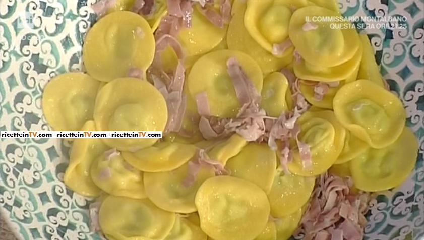 Per il condimento, in padella, sciogliamo 3/4 del burro. Uniamo il prosciutto, cotto e crudo, a listarelle. Facciamo rosolare qualche minuto.