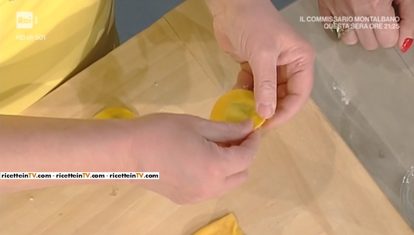 Sulla sfoglia, formiamo dei mucchietti di ripieno. Ripieghiamo la sfoglia sul ripieno. Pressiamo verso l’esterno, in modo da eliminare tutta l’aria. Ritagliamo con un coppapasta tondo. Pressiamo con i pollici i bordi, in modo da assottigliarli. Facciamo asciugare per qualche minuto. Quindi ripetiamo l’operazione, schiacciando con i pollici i bordi.