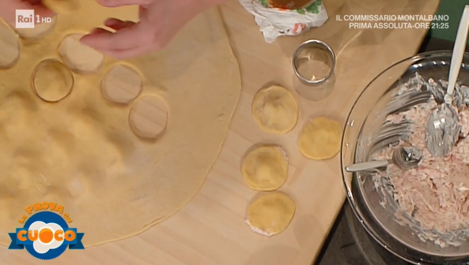 Formiamo su metà sfoglia delle noci di ripieno. Copriamo con l’altra metà della sfoglia e facciamo ben aderire, facendo uscire tutta l’aria. A questo punto ricaviamo i ravioli con un coppapasta. Con i pollici, quindi, pressiamo i bordi di ciascun raviolo, in modo da assottigliarli. Cuociamo in acqua bollente e salata. Scoliamo e saltiamo con il condimento alle verdure.