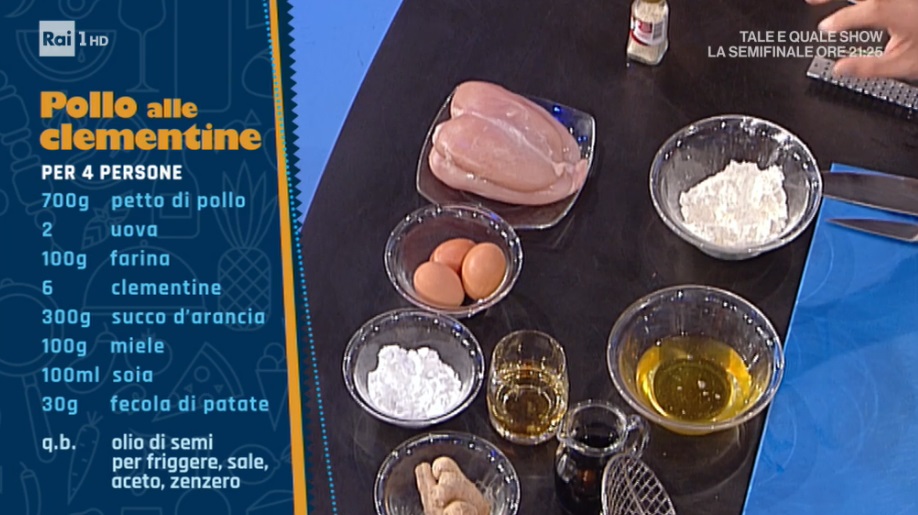 • 700 g petto di pollo, 2 uova, 100 g farina, 6 clementine, 300 g succo d’arancia, 100 g miele, 100 ml soia, 30 g fecola, olio per friggere, sale, aceto, zenzero