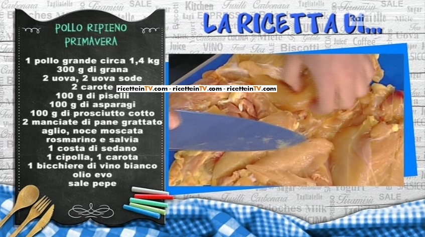 - 1 pollo grande circa 1,4 Kg, 300 g grana, 2 uova, 2 uova sode, 2 carote, 100 g piselli, 100 g asparagi, 100 g prosciutto cotto, 2 manciate di pane grattato, aglio, noce moscata, rosmarino e salvia, 1 costa di sedano, 1 cipolla, 1 carota, 1 bicchiere di vino bianco, olio evo, sale e pepe
