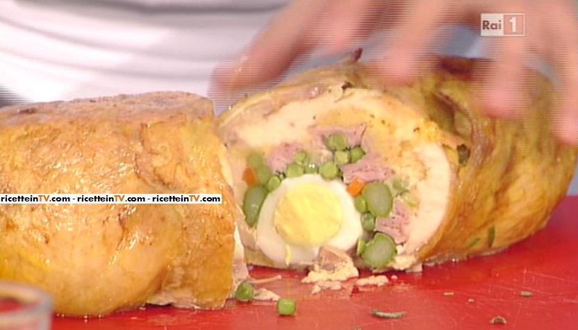 Chiediamo al macellaio di disossare ed aprire un pollo; se necessario, trasferiamo parte della carne in eccesso del petto sulle parti carenti di carne, in modo da ottenere uno strato di carne omogeneo. Lessiamo e tagliamo a listarelle le carote e gli asparagi; scottiamo il pangrattato con un paio di mestoli di brodo; profumiamo con la noce moscata; aggiungiamo il parmigiano e le uova crude. Lavoriamo e, ottenuto un composto compatto, lo disponiamo sopra al pollo; mettiamo sopra i piselli saltati, le carote e gli asparagi; e ancora le uova sode uno in fila all’altro ed il prosciutto; ripieghiamo su se stesso il pollo, quindi lo ricuciamo per bene, in modo da sigillare all’interno il ripieno. Lo mettiamo su un foglio di carta forno, quindi lo copriamo con le erbe aromatiche, sale e pepe, lo arrotoliamo con la carta da forno e lo mettiamo su una teglia, bagnando con il vino bianco; inforniamo per 1 ora; l’ultima mezz’ora di cottura lo facciamo cuocere scoperto, senza carta forno.