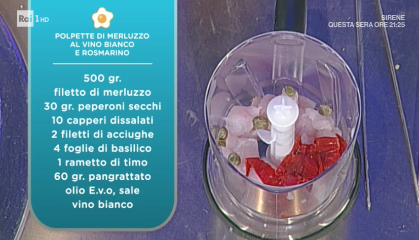 - 500 g merluzzo, 30 g peperoni secchi, 10 g capperi dissalati, 2 filetti di acciughe, 4 foglie di basilico, 1 rametto di timo, 60 g pangrattato, olio evo, sale, vino bianco