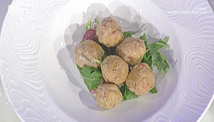 Serviamo le polpettine su un letto di cipolla rosolata e rucola.