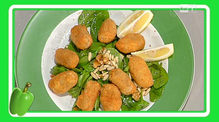 Ingredienti: 400g di carne macinata mista, 100g di provola, 200g di mollica di pane, latte q.b., 1 uovo, pangrattato q.b., prezzemolo q.b., noce moscata q.b., farina q.b., sale q.b., olio di semi di arachide per friggere q.b. per l’insalata: 100g di spinacini, 40g di pinoli, 50g di noci sgusciate, aceto balsamico q.b., olio extravergine di oliva q.b., sale q.b.