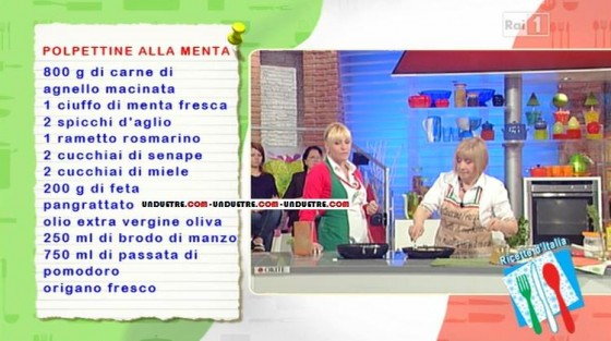 Vi proponiamo una gustosa ricetta realizzata in una delle ultime edizioni de La prova del cuoco. Per lo spazio riservato alle ricette d’Italia, Anna Moroni, dopo aver ballato ‘Come è bello far la cuoca da Trieste in giù‘ ed aver ascoltato le raccomandazioni di Antonella che la prega eliminare il caschè per paura che Anna si faccia male, è pronta per preparare le polpettine alla menta, suggerite da Federica di Reggio Emilia, in collegamento telefonico con lo studio.